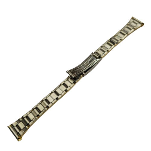 Bracelete em aço bicolor dourado e prateado e com fecho de báscula e chapa comprida. Disponível na medida: 12MM.