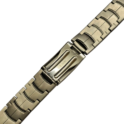 Bracelete em aço semi-sólido com fecho de chapa comprida.