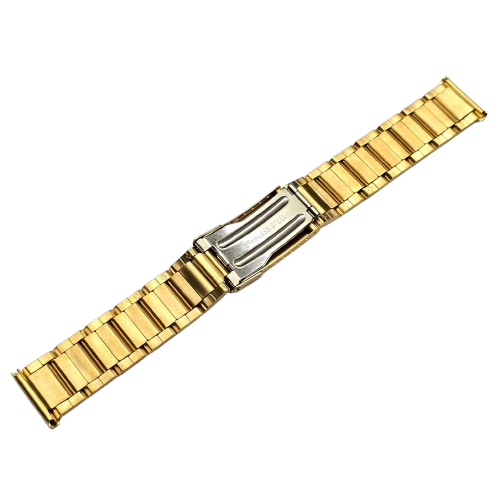 Bracelete em aço dourado com fecho de báscula, chapa comprida e patilha de segurança.