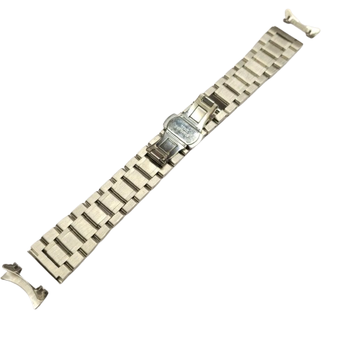Bracelete em aço prateado semi-sólido com terminal curvo e direito e fecho mariposa. Disponível nas medidas: 19, 20, 21, 22 e 24MM.