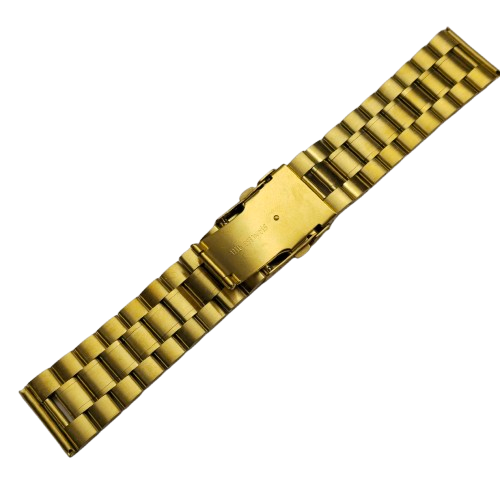 Bracelete em aço sólido dourado com fecho de báscula e chapa comprida com molas. Disponível nas medidas: 24 e 26MM.