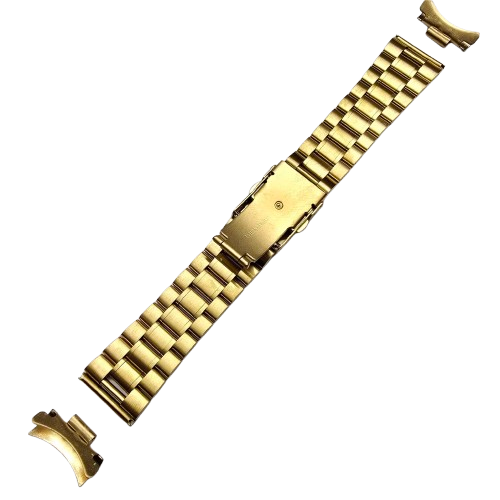Bracelete aço solido dourado. Disponível nas medidas: 18, 20, 22 e 24MM. Inclui terminal curvo e direito.