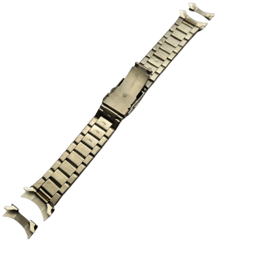 Bracelete em aço semi-sólido com terminais curvos com fecho de báscula chapa comprida e patilha de segurança e molas.