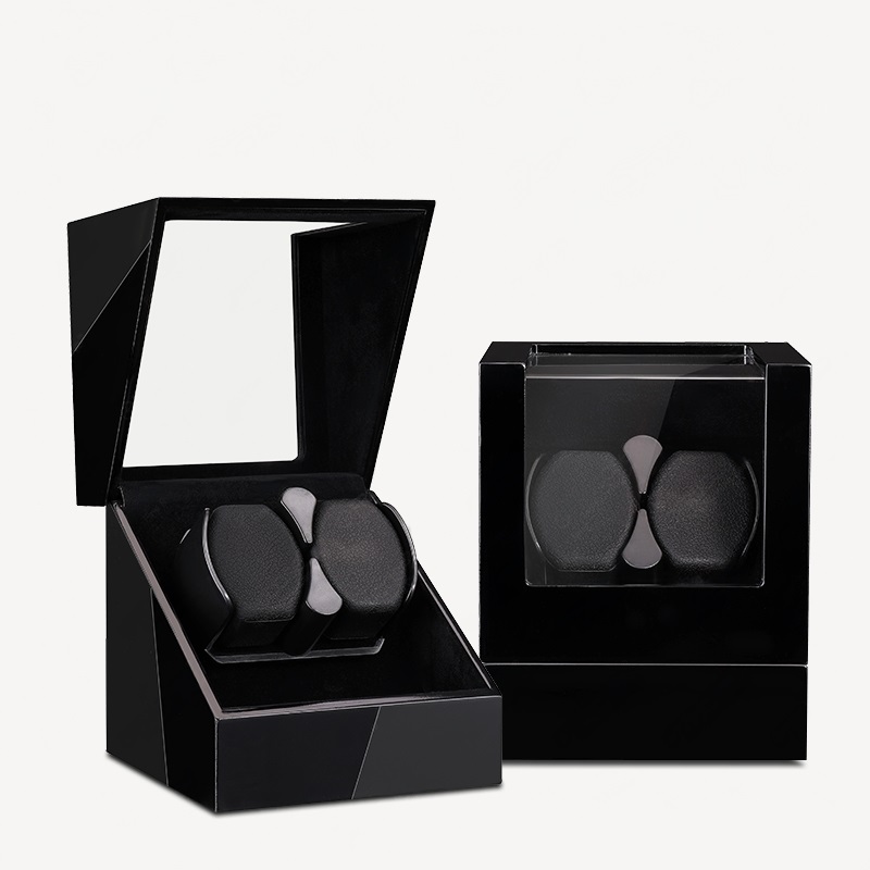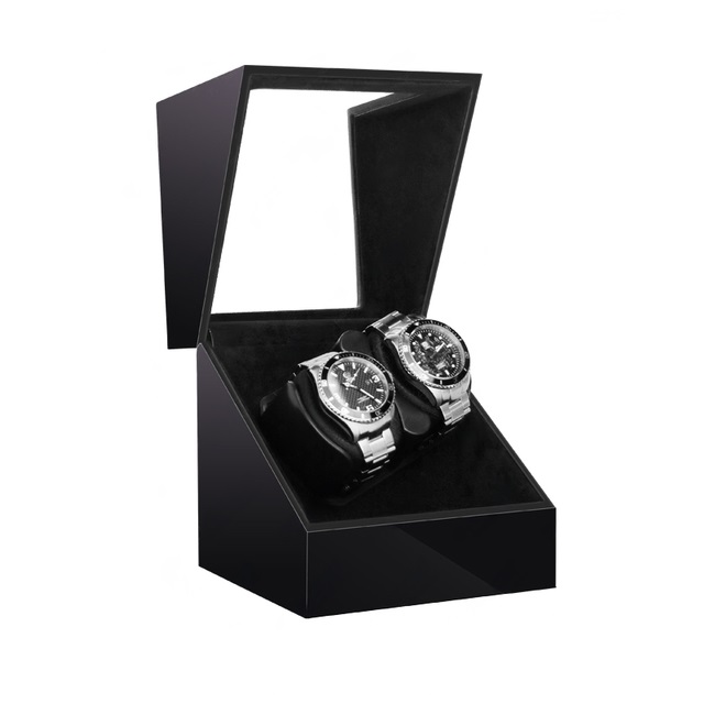 Caixa rotativa para carregar e guardar 2 relógios automáticos em madeira com acabamento exterior em piano negro e o interior forrado a veludo preto.