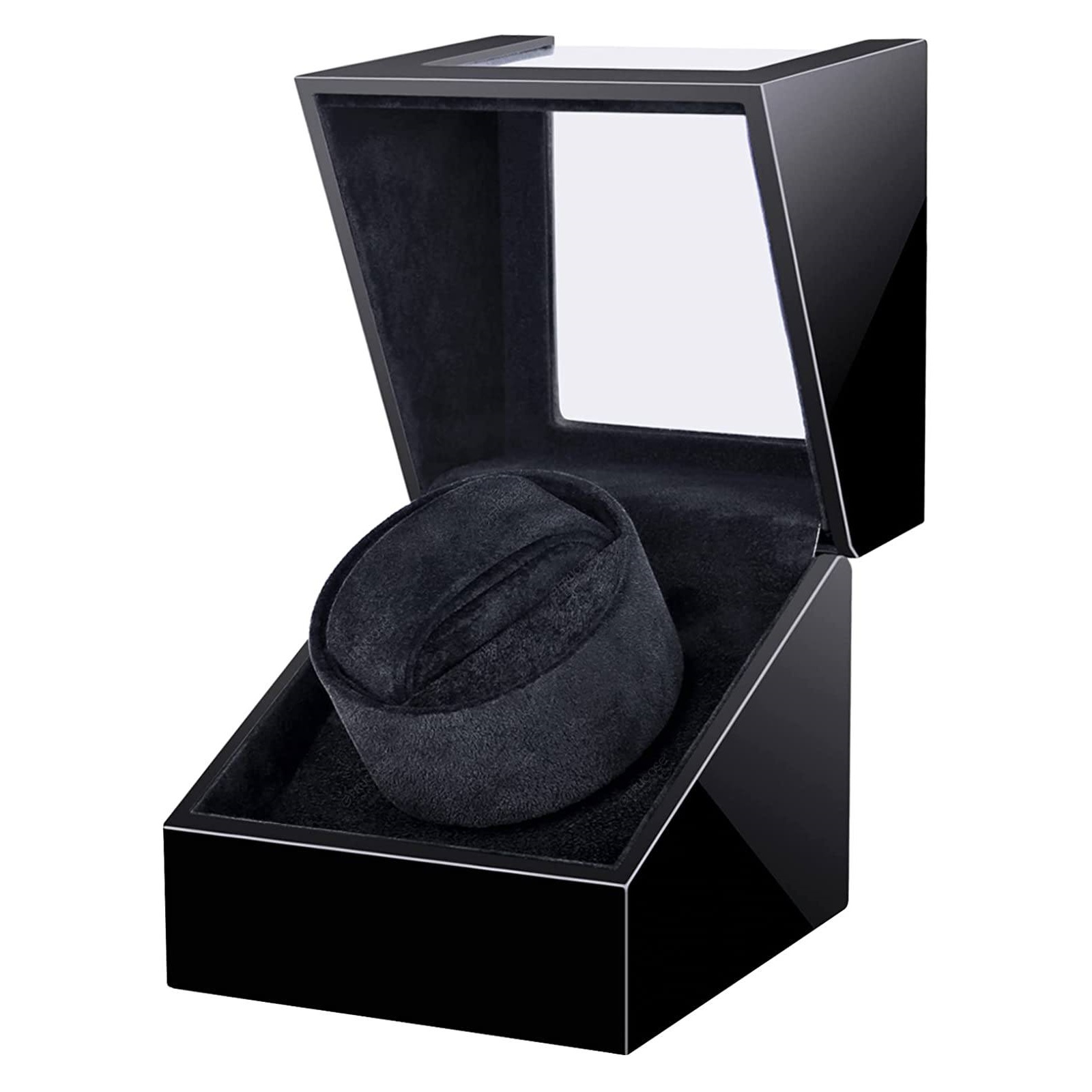 Caixa rotativa para carregar e guardar relógio. Com acabamento exterior piano negro e interior forrado a veludo na cor preta.