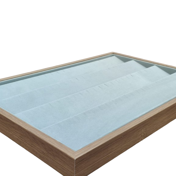 Tabuleiro em madeira forrado em veludo na cor cinza para fios. Medidas: 36X25X3CM