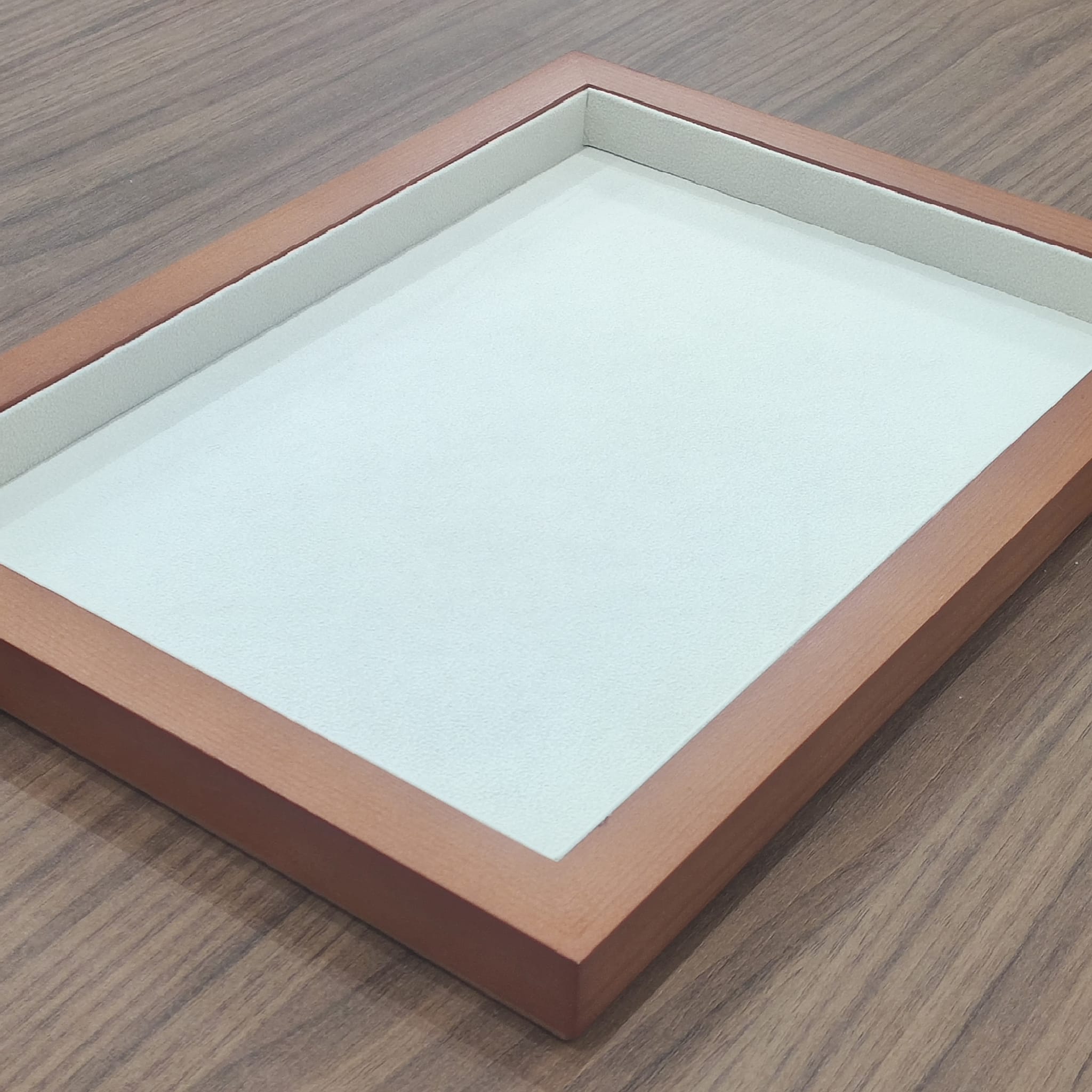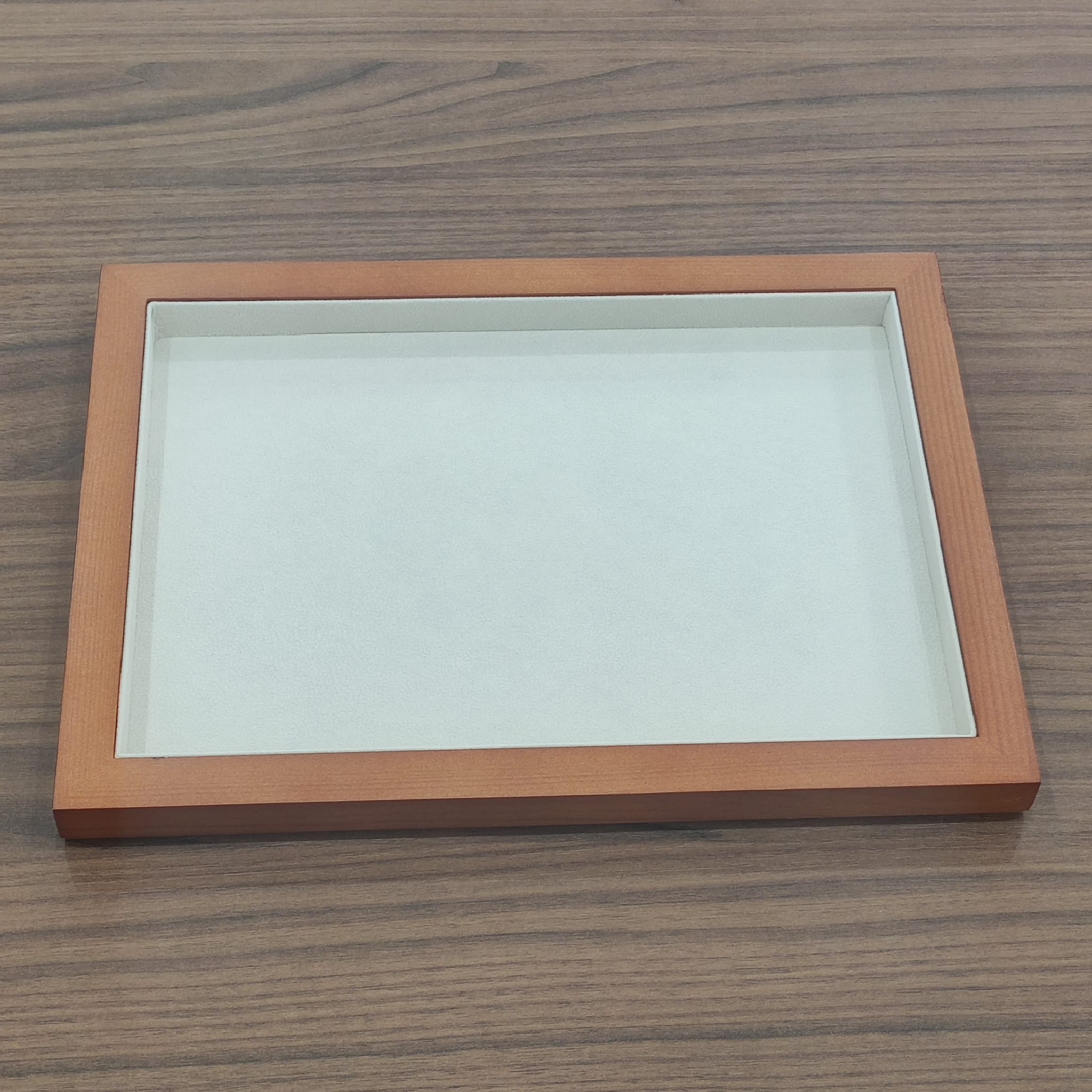 Tabuleiro em madeira forrado a veludo para mostrar.