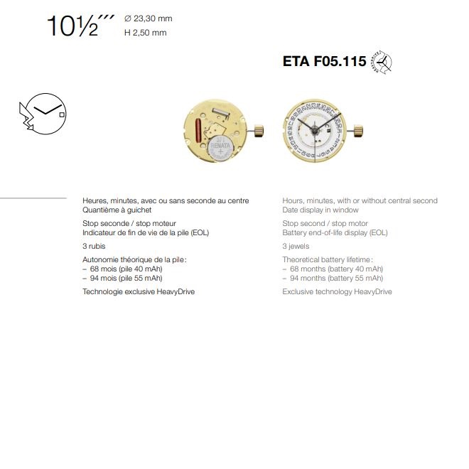 Movimento ETA EF05115, calendário às 3H e 2 ponteiros.
